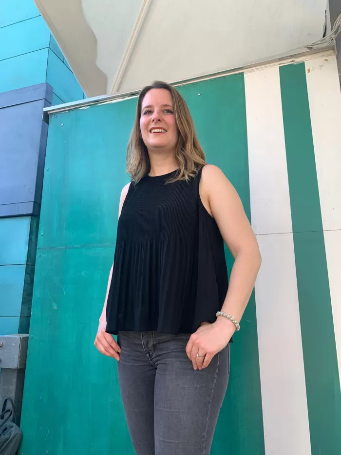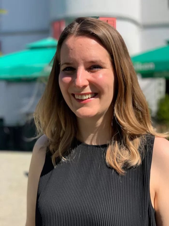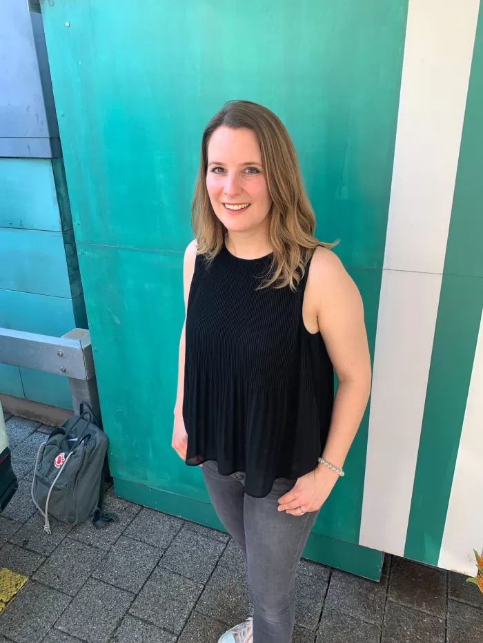«Hier wurde direkt in die Sonne fotografiert, die damit wie ein Gegenlicht wirkt. Das Sonnenlicht fällt direkt auf den Hinterkopf von Manuela. Das Handy ist mit der sauberen Darstellung des Hintergrunds, dem Himmel mit Wolken, und einem korrekt belichteten Gesicht im Vordergrund überfordert. Der Himmel ist weiss aufgrund dieser Überbelichtung. Auch hier ist der Hintergrund sehr unruhig, was von Manuela ablenkt», ordnet Alex das Bild ein.