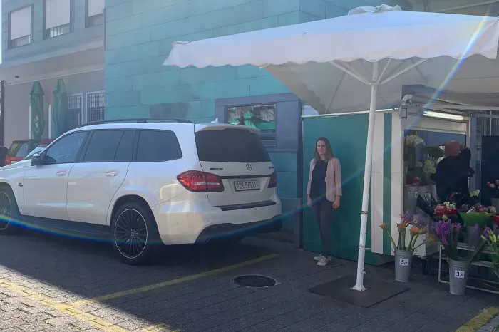 Das zufällig dort parkende, weisse Auto trägt ebenfalls seinen Teil dazu bei. Es gibt Manuelas Gesicht einen Kontrast aufgrund der Reflektion, die rechte Gesichtshälfte ist heller. Der Hintergrund ist ruhig und passt farblich zum Typ und Kleidung.