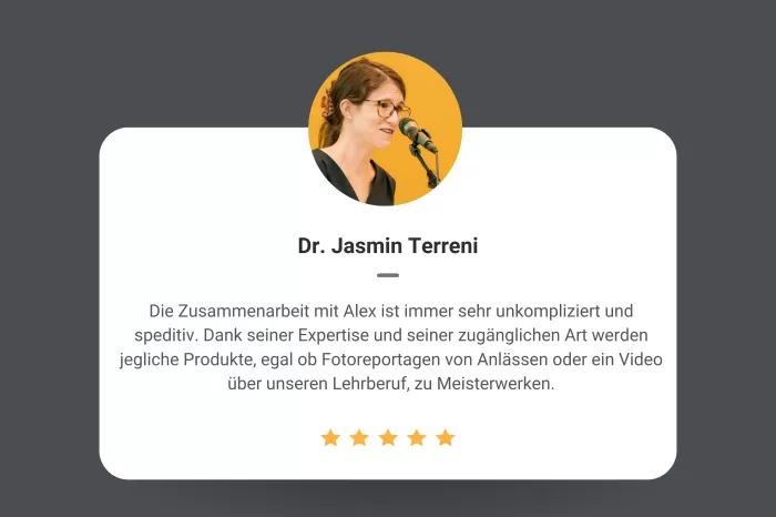 Mit Alex haben Sie schnell nutzbares Material: 10–20 Same-Day-Edits in 24 Stunden für Website, LinkedIn und Presse. Danach 20–40 starke Motive plus 3–5 kurze Hochkant-Clips. Alles sauber benannt, als passwortgeschützte Galerie, in Web- und Druckqualität. Nutzungsrechte: für Ihre Firma, ohne Zeitlimit.